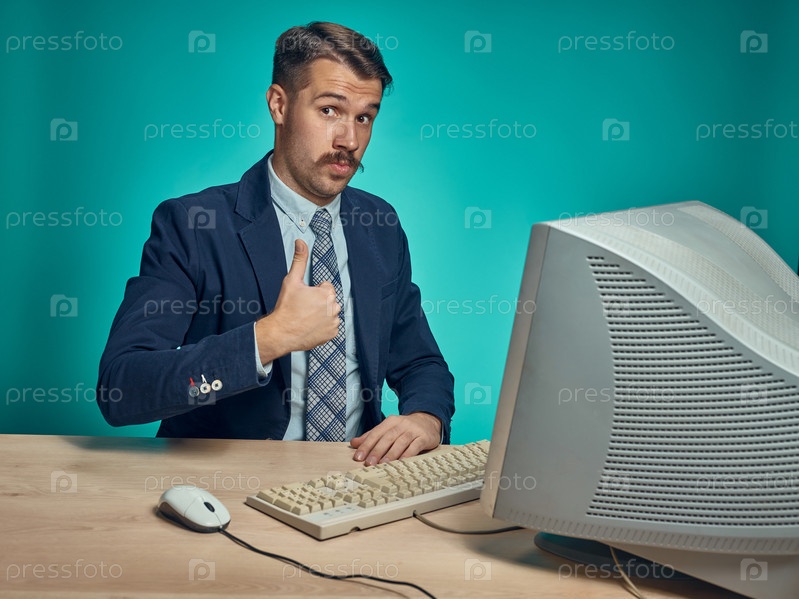 Счастливый молодой бизнесмен и старый компьютер