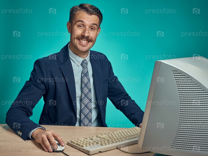 Веселый молодой бизнесмен и старый компьютер