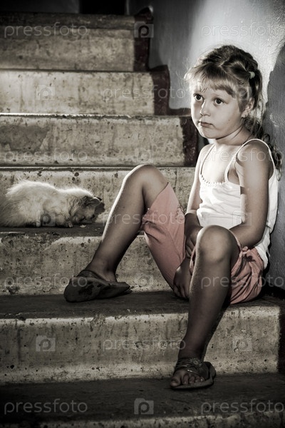 Маленькая девочка и котенок на лестнице