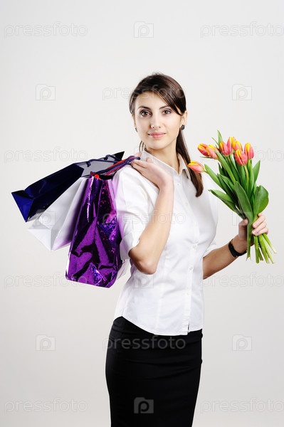 Портрет молодой женщины с тюльпанами и пакетами в руках