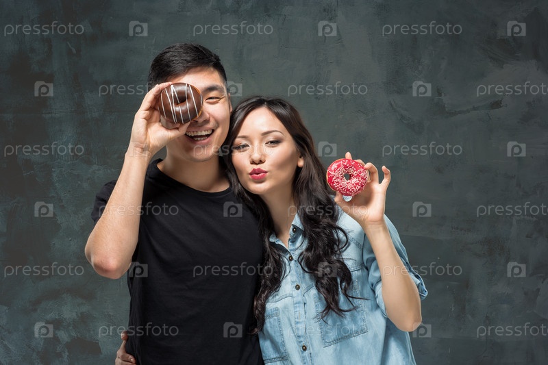 Веселая азиатская пара с пончиками