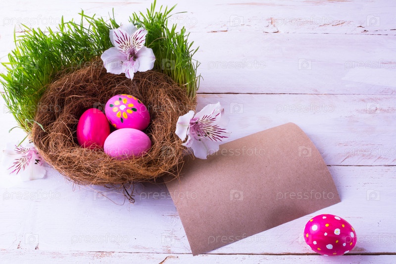 Пасхальные яйца в гнезде с белыми цветами