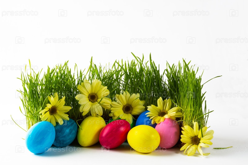 Разноцветные пасхальные яйца в зеленой траве