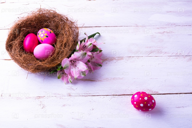 Розовые пасхальные яйца в гнезде