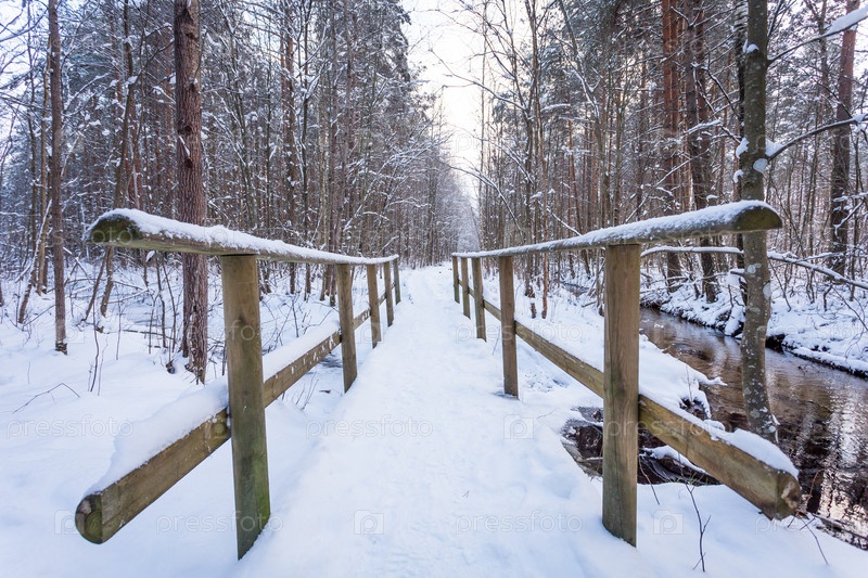 Деревянный мост в зимнем лесу