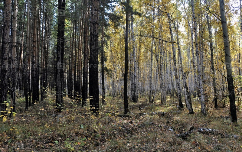 Осенние березы и сосновый лес