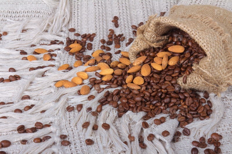 Мешок с кофейными зернами и миндалем на фоне текстиля