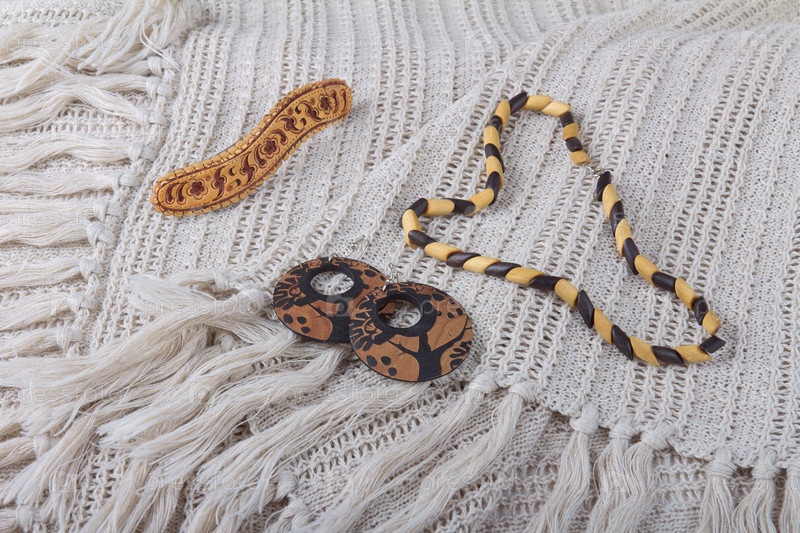 Деревянная бижутерия на фоне текстиля