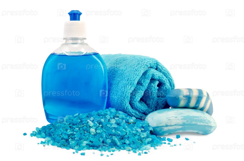 Синее жидкое мыло во флаконе, твердое мыло, соль для ванны, полотенце на белом фоне