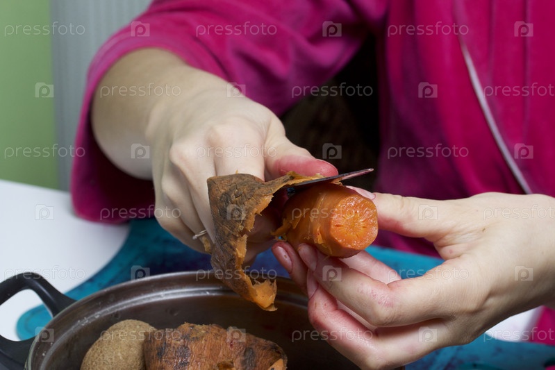 Женщина чистит морковь