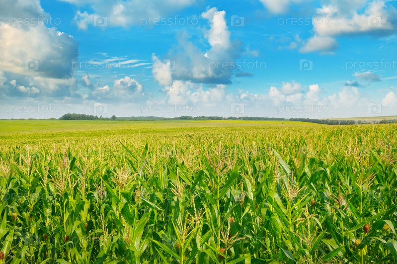 Зеленое кукурузное поле и голубое небо