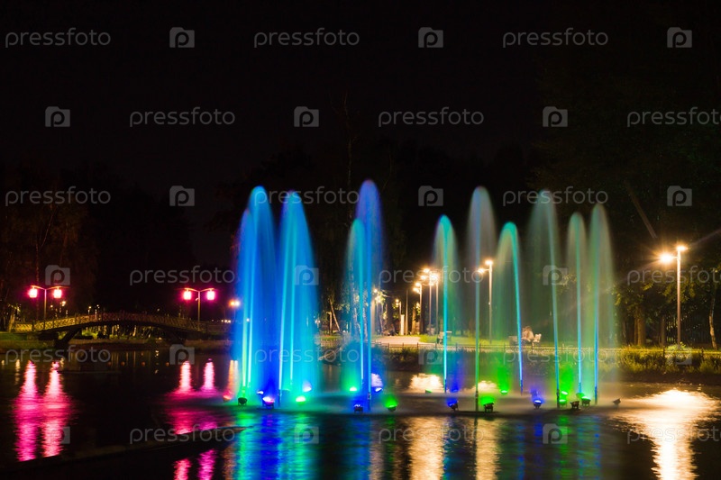Фонтан с подсветкой на пруду в парке
