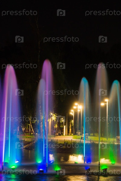 Фонтан с подсветкой на пруду в парке
