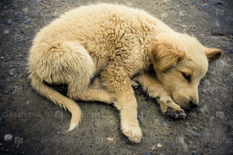 Щенок спящий на асфальте