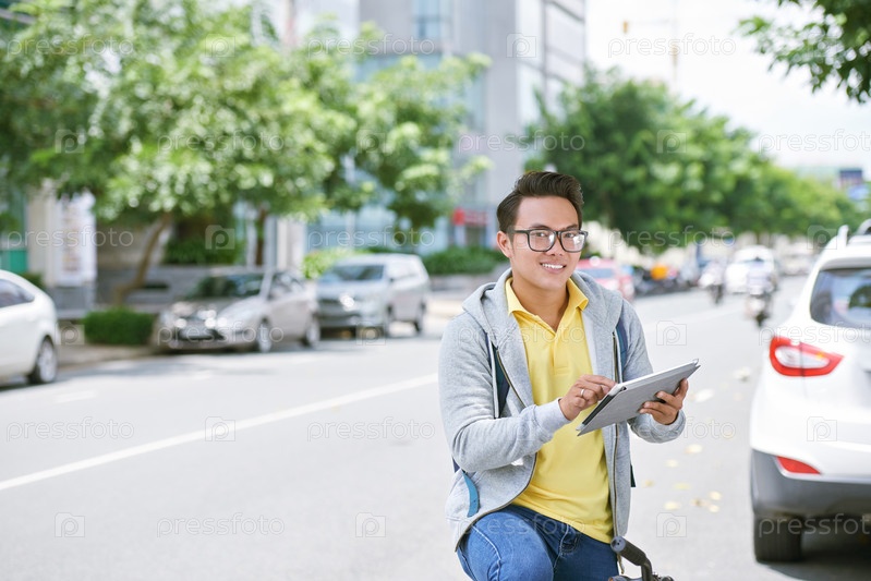 Веселый парень с цифровым планшетом
