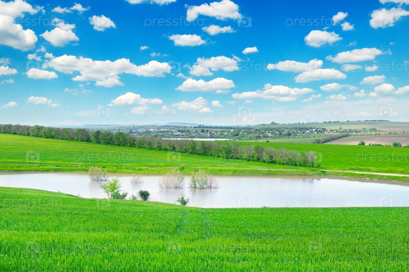 Зеленое поле, озеро и пасмурное небо