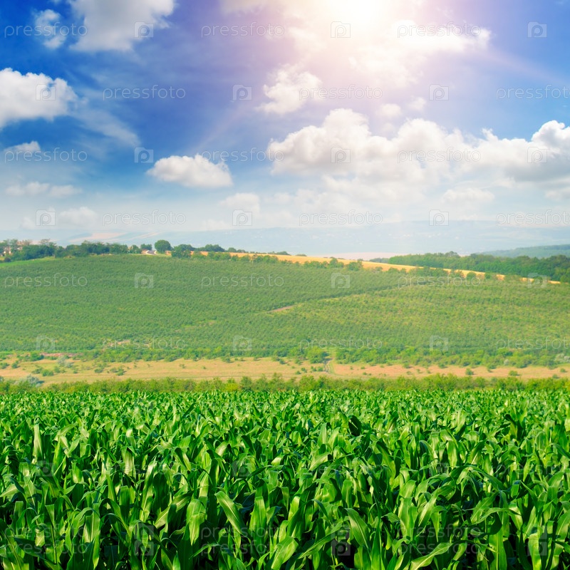 Зеленое кукурузное поле и голубое небо