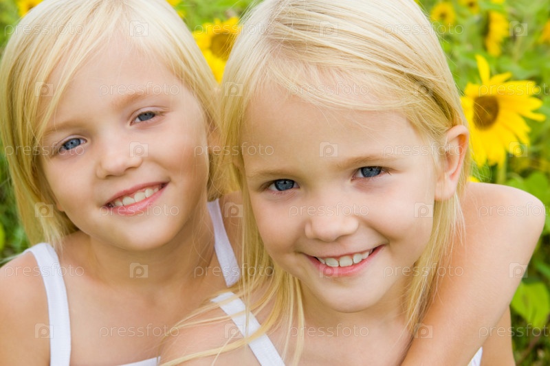 Портрет симпатичной девушки, обнимающей свою сестру-близнюшку и смотрящей на камеру с улыбкой