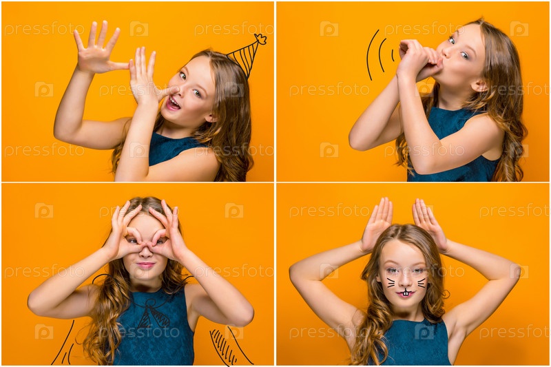 Коллаж веселой девушка с длинными волосами