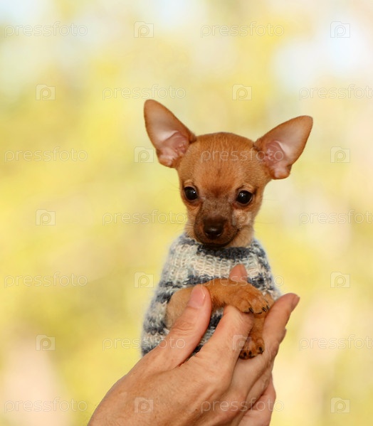 Крошечный рыжий щенок в вязаной кофте