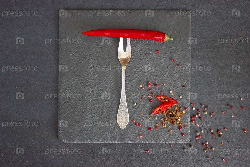 Красный перец на вилке. Острые специи