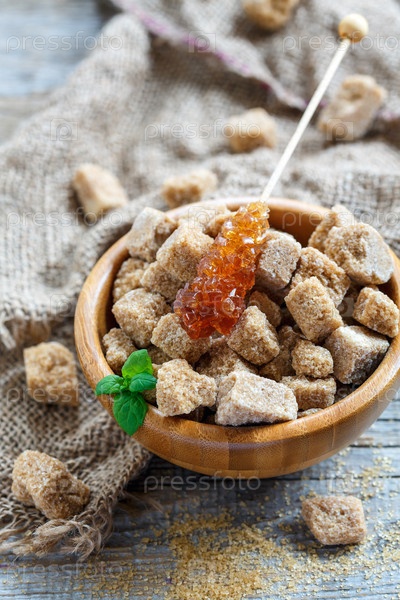 Кубики из сахарного тростника и мяты в деревянной миске