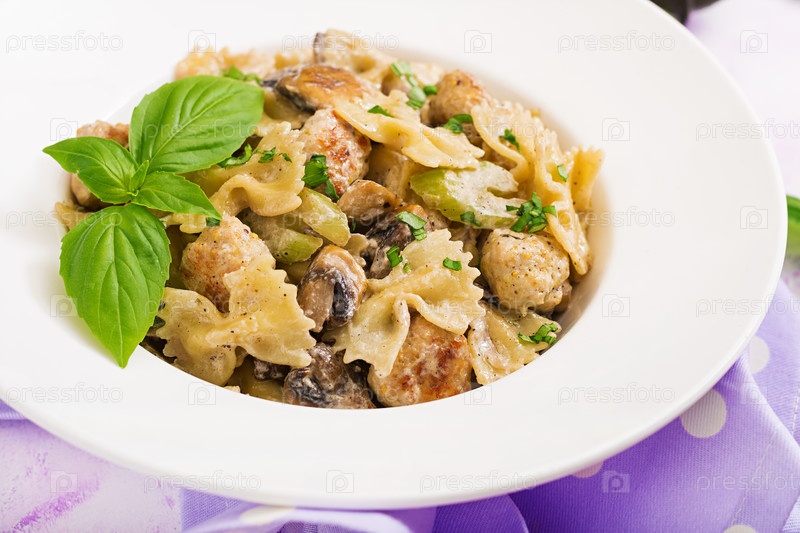 Макароны с грибами в сливочном соусе и фрикадельки