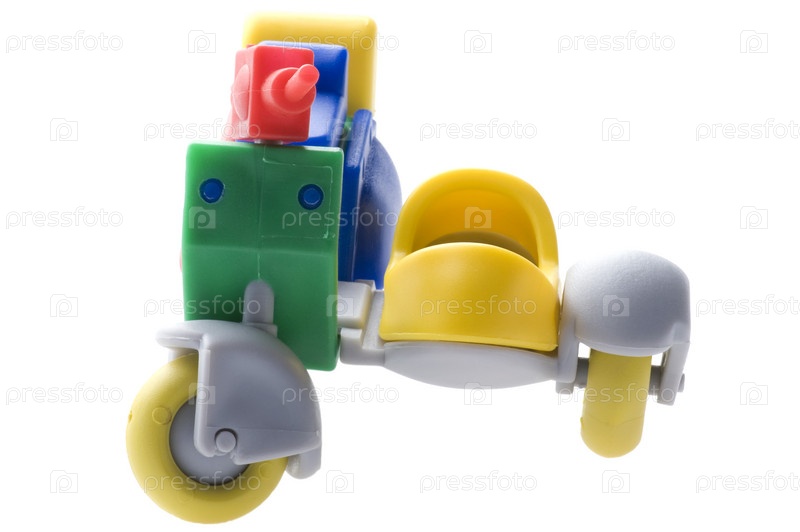 Объект на белом игрушечном мотоцикле с повозкой
