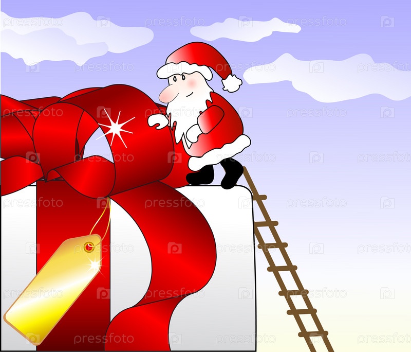 Санта-Клаус на стремянке с большим рождественским подарком на фоне неба