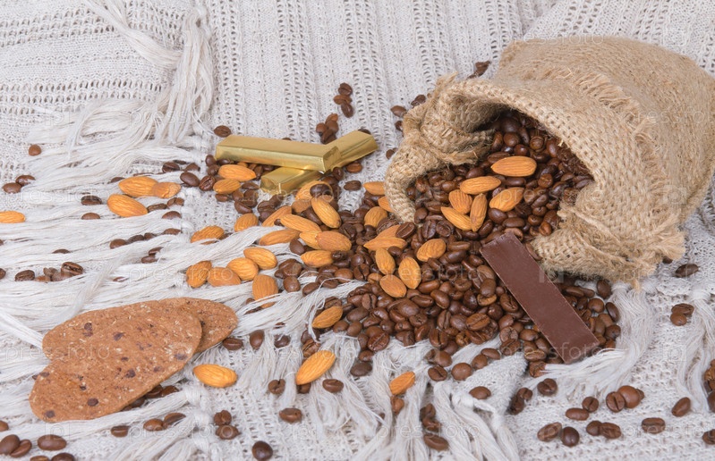 Печенье, шоколад, кофейные бобы и миндаль в мешке