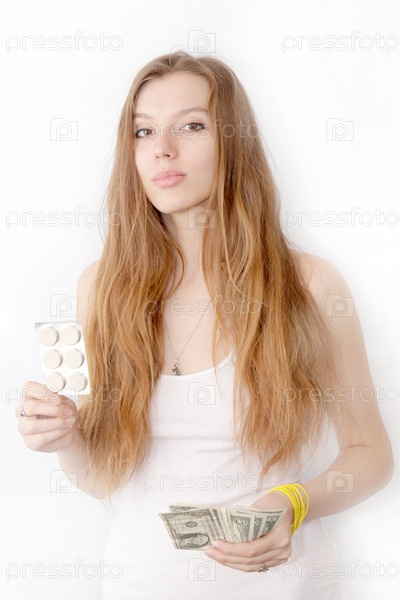 Рыжеволосая девушка с пачкой таблеток и долларами на белом фоне