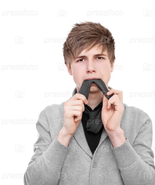 Странный молодой человек в сером кардигане ест свой галстук
