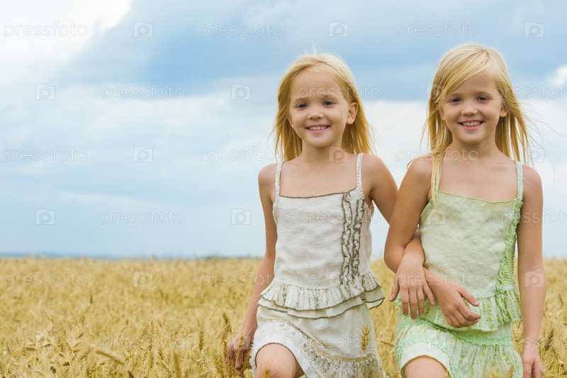 Портрет милых близнецов, гуляющих по пшеничному поле и улыбающихся