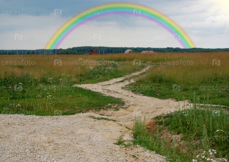 Радуга в голубом небе над полем