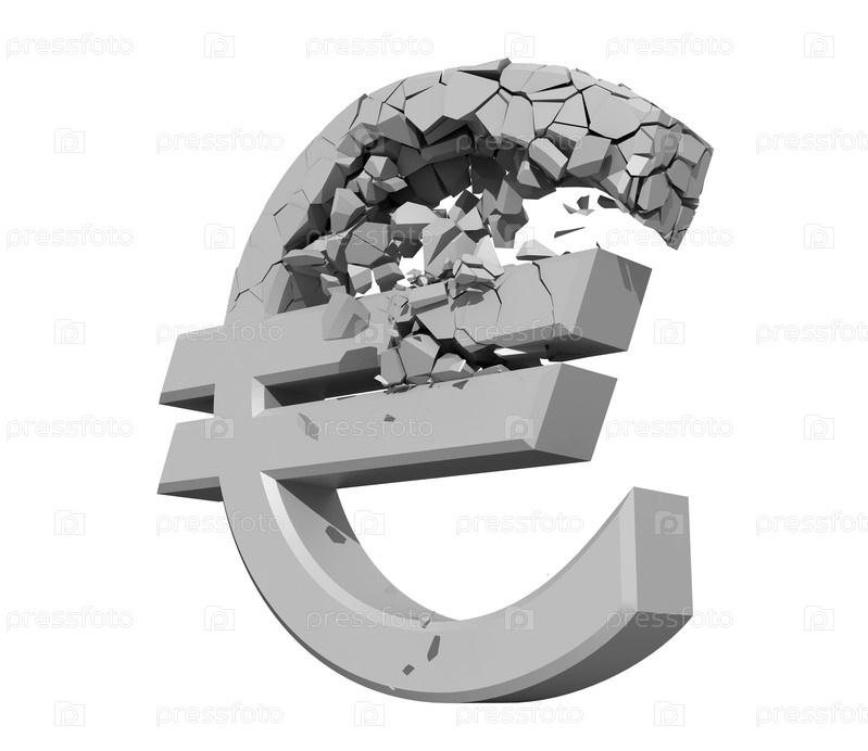 Разрушающийся символ евро на белом фоне