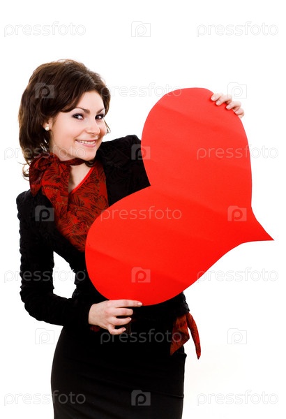 Девушка держит большое красное бумажное сердце