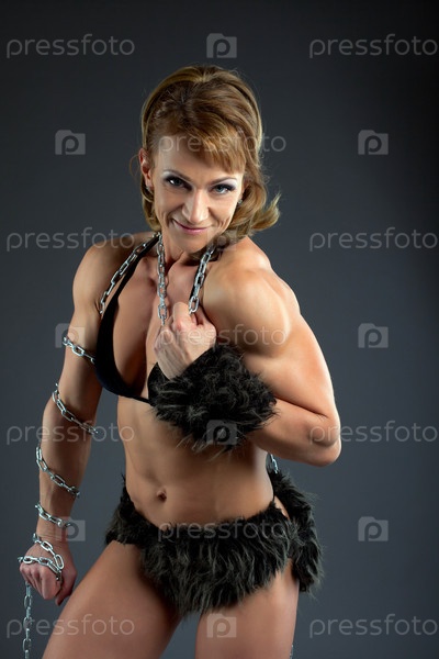 Сильная атлетичная женщина-бодибилдер в меховом костюме амазонки с цепью
