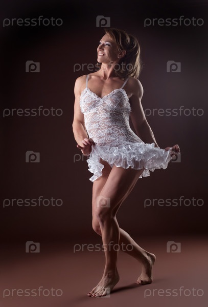Сильная женщина-бодибилдер в кружевном белье