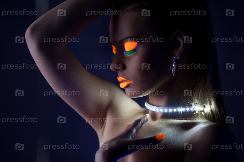 Красивая женщина танцует с макияжем, сияющем в ультрафиолетовом свете