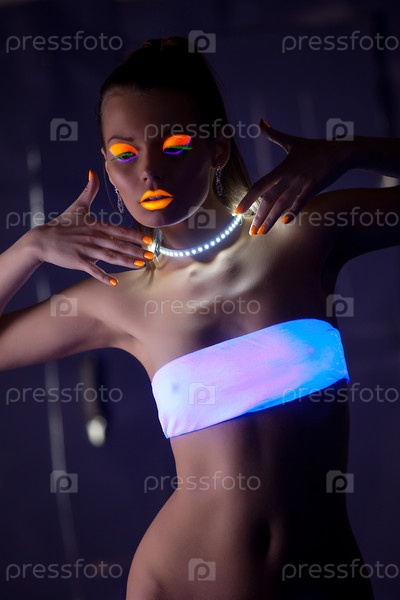 Сексуальная женщина со светящимся макияжем танцует в ультрафиолетовом свете