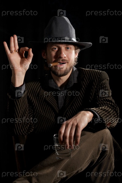 Бородатый человек с бокалом виски и сигарой
