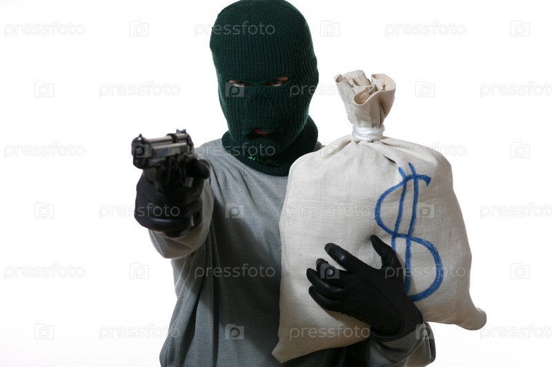 Человек в маске с пистолетом и мешком денег