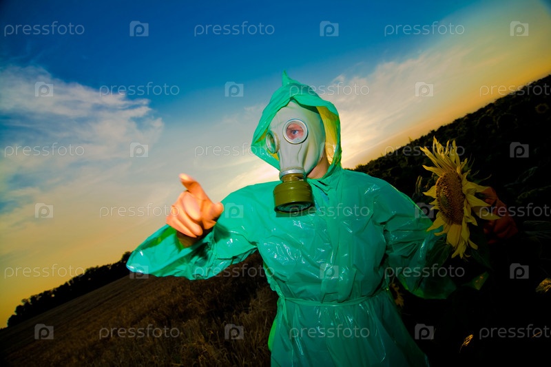 Человек в респираторе на поле подсолнечника