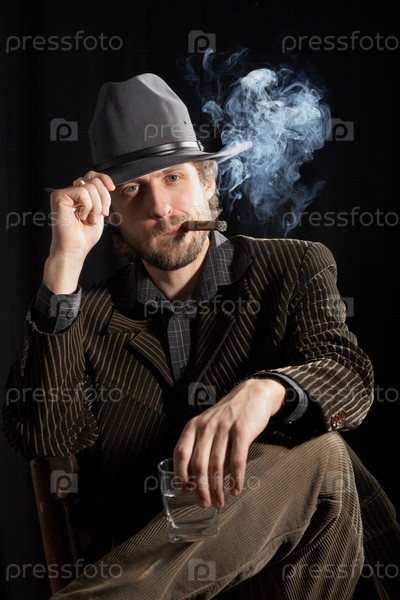 Бородатый человек с бокалом виски и сигарой