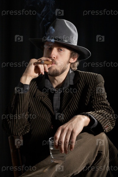 Бородатый человек в серой шляпе с бокалом виски и сигарой