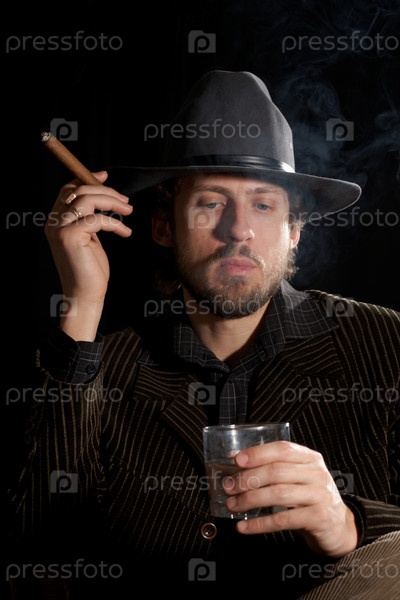 Бородатый человек в серой шляпе с бокалом виски и сигарой