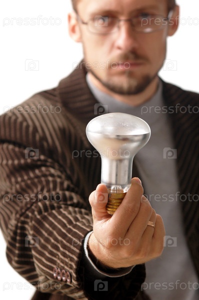 Бизнесмен показывает электрическую лампу