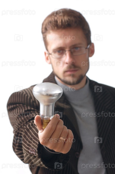 Бизнесмен показывает электрическую лампу