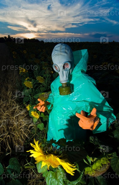 Человек в респираторе на поле подсолнечника