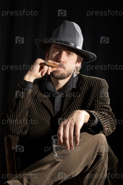 Бородатый человек в серой шляпе с бокалом виски и сигарой